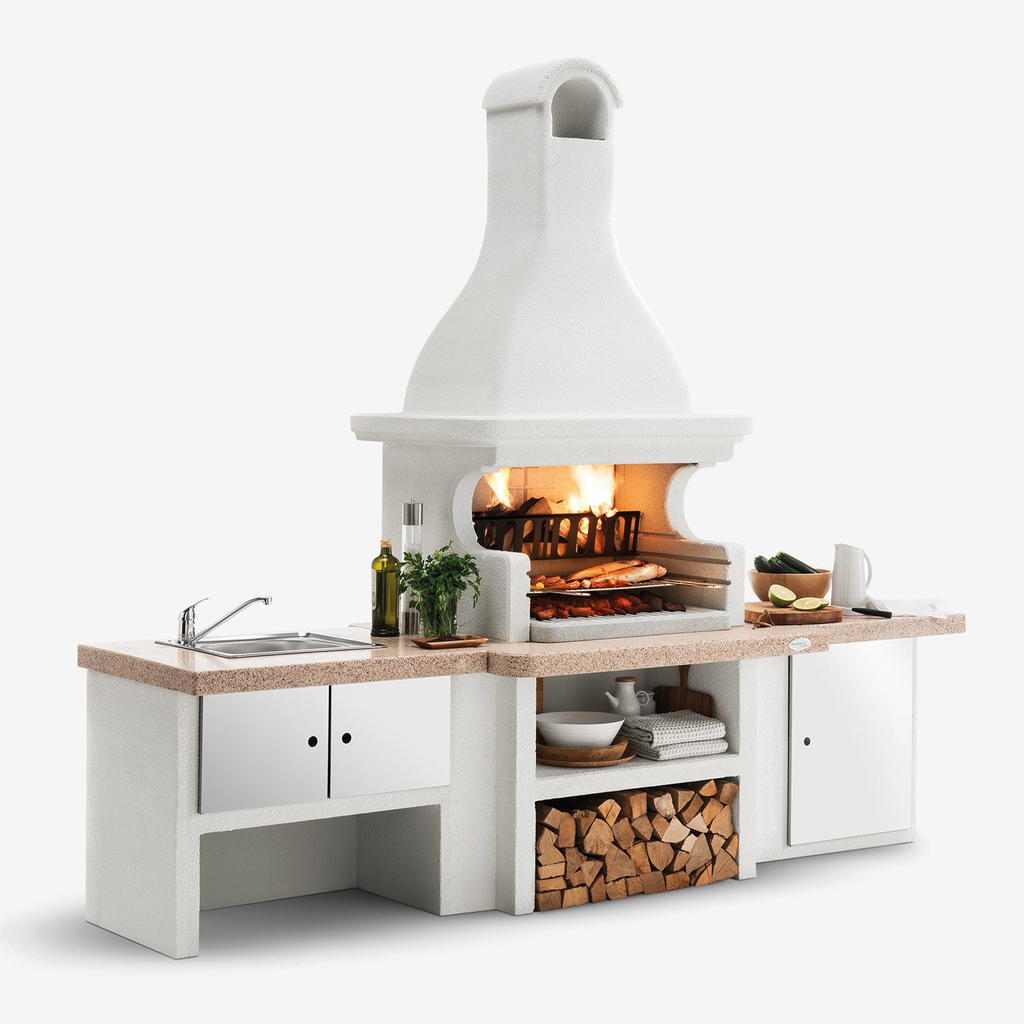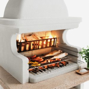 Um prático barbecue a lenha ou a carvão de pequenas dimensões, que pode colocar em diferentes contextos: jardim, alpendre, terraço! A bancada é em Marmotech polido com acabamento em granito vermelho ou cinza.